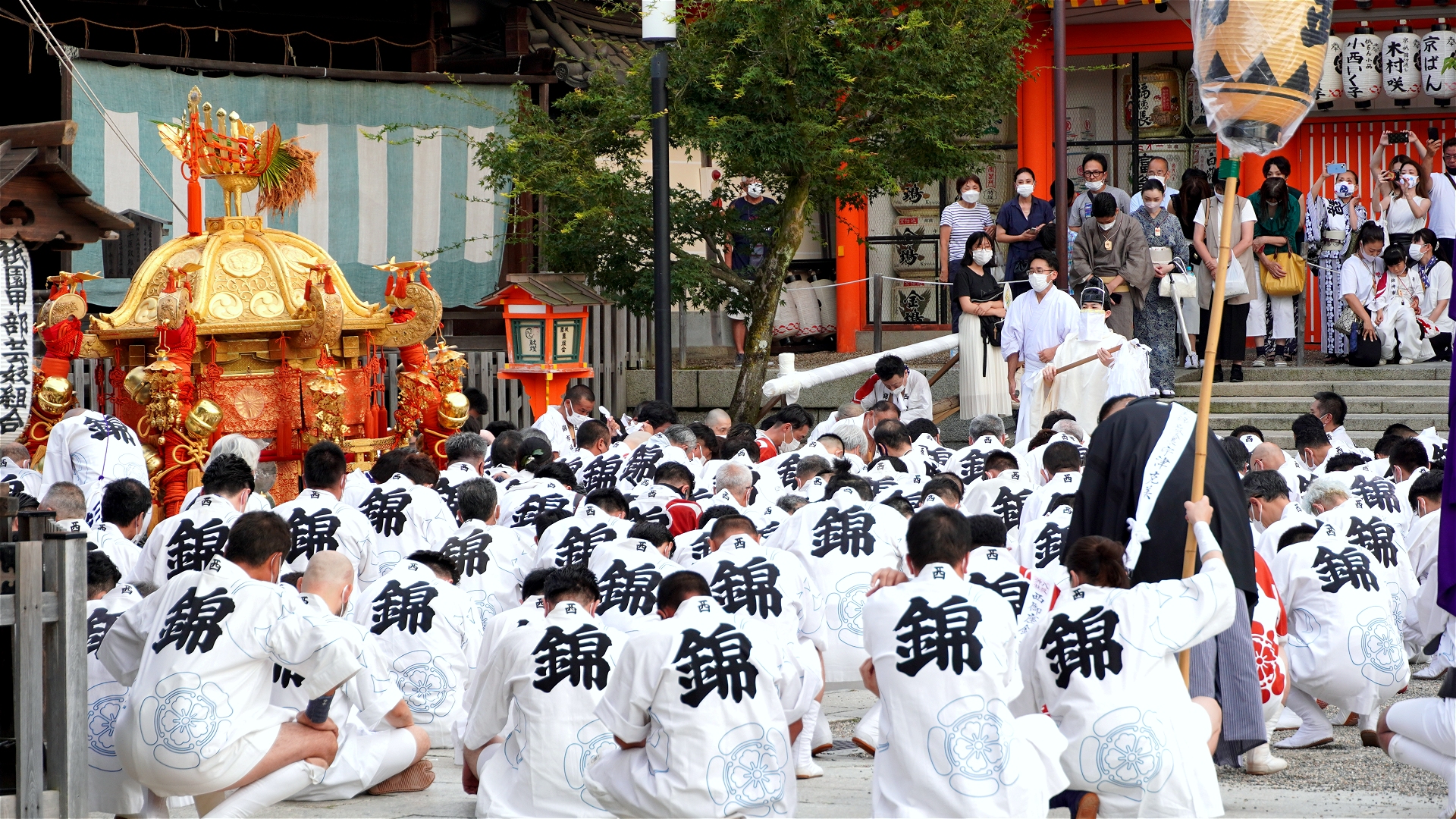 今年はコロナのせいで出発式は取りやめということだったが、神輿渡御 は開催される。 15:30、ということで八坂神社の境内に… でも、やっぱりみんな知っている。大混雑です… 舞殿にはお神輿が…